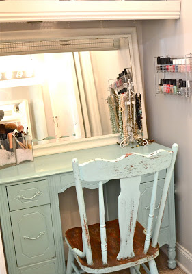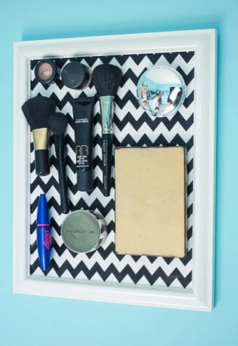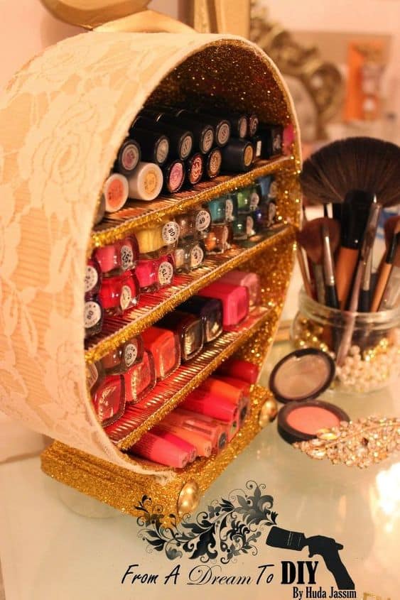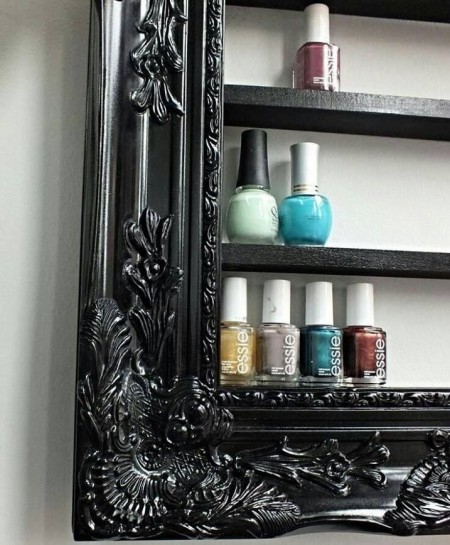 Add shelves to a an old photo frame and decorate accordingly! Then store nail polish, skin care products, make up, and more!