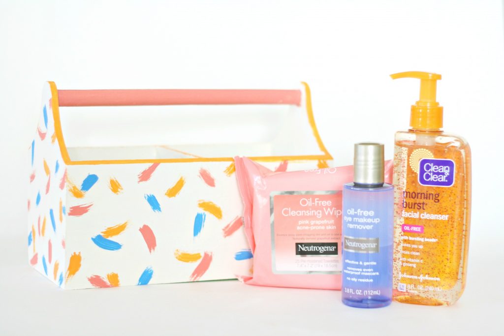 Dress up a basic white caddy with some acrylic paint! Then gift it with you basic skincare products!