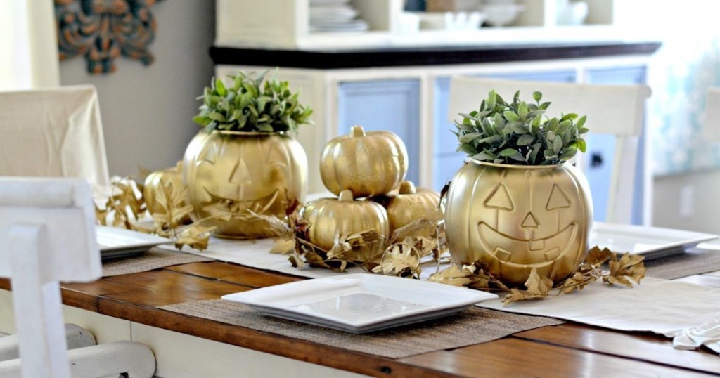 Turn a dollar store plastic jack-o-lantern into this metallic planter!