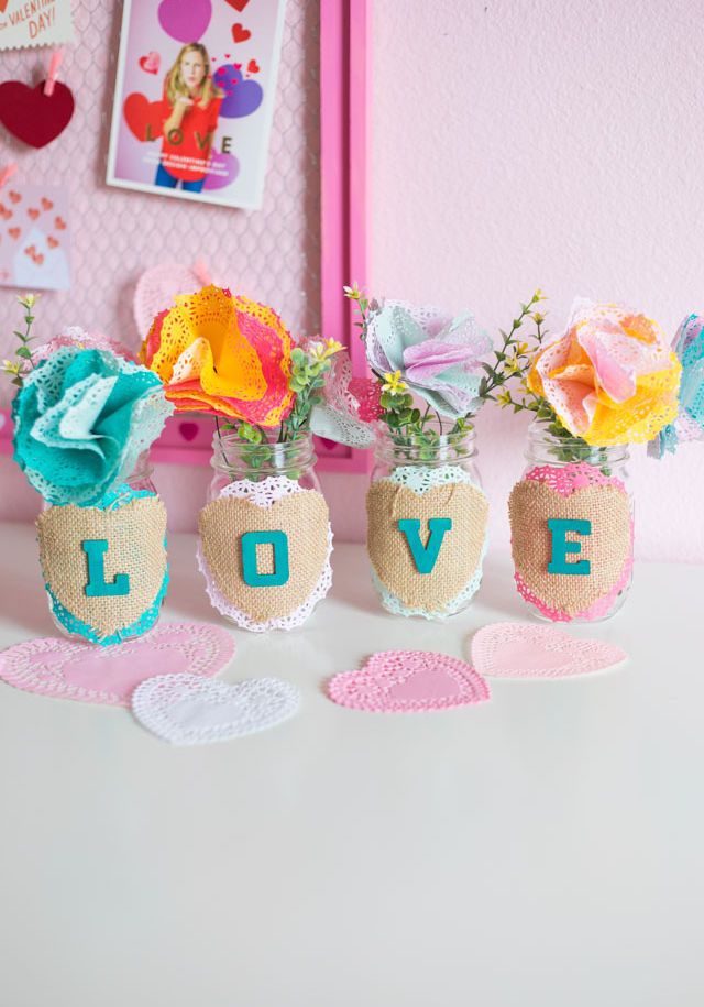 Add a big pop of color to your friend’s office or room by making these mason jar vases and filling them with flowers, paper flowers, or origami hearts!