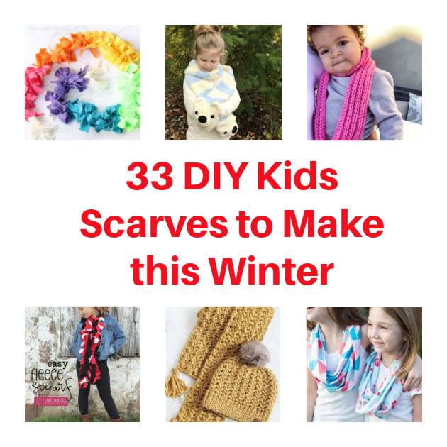We’ve found you 33 terrific DIY projects to try. For children of all ages, and a variety of styles. So whether you’d like to make a scarf for a baby, toddler, elementary school child, tween or a teenager, there is a great scarf pattern here for you. There are even no sew scarf DIY projects for you. You’ll also see knitting, crochet and fleece scarf patterns too.