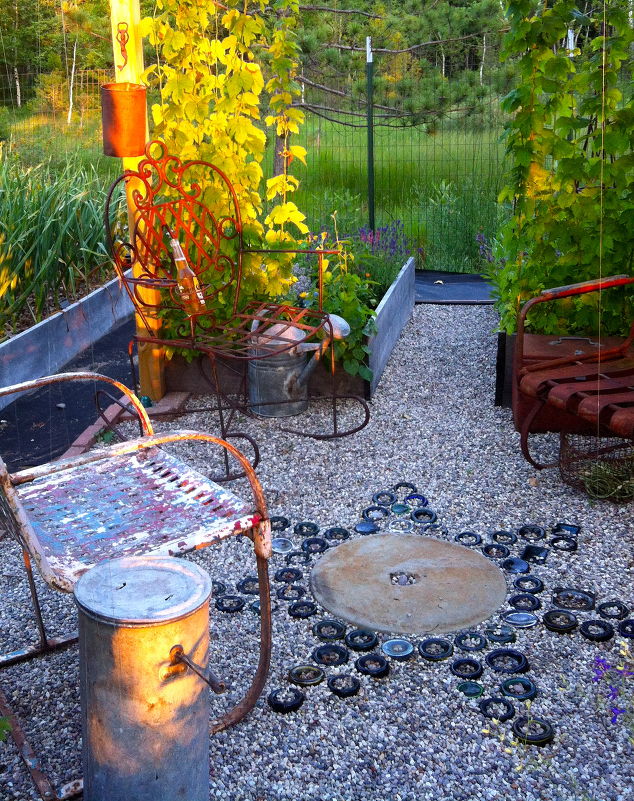 Wine bottles were used to create this design in the pebble patio!