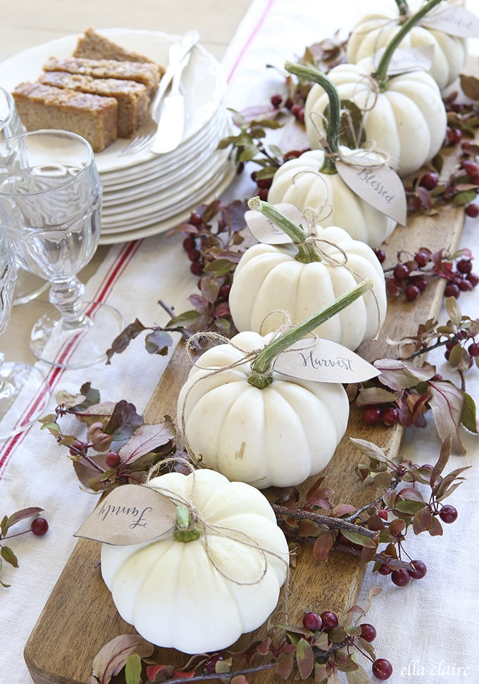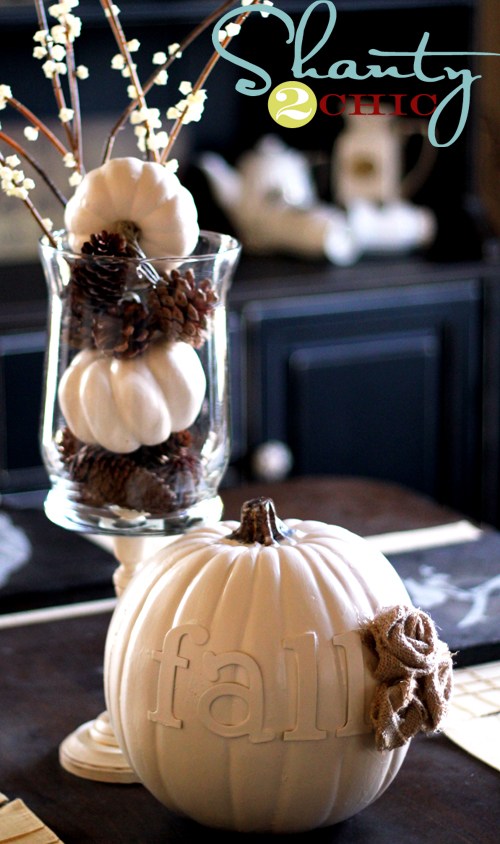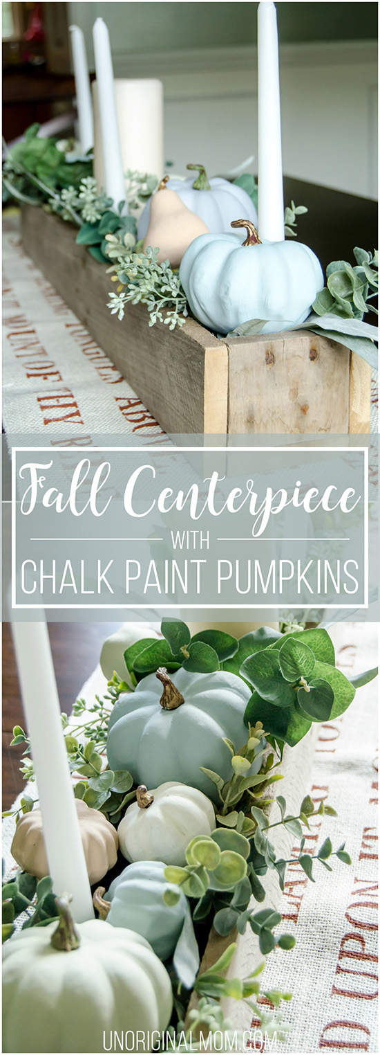This chalk painted pumpkin table center is adorable and gives your pumpkins something a little extra!