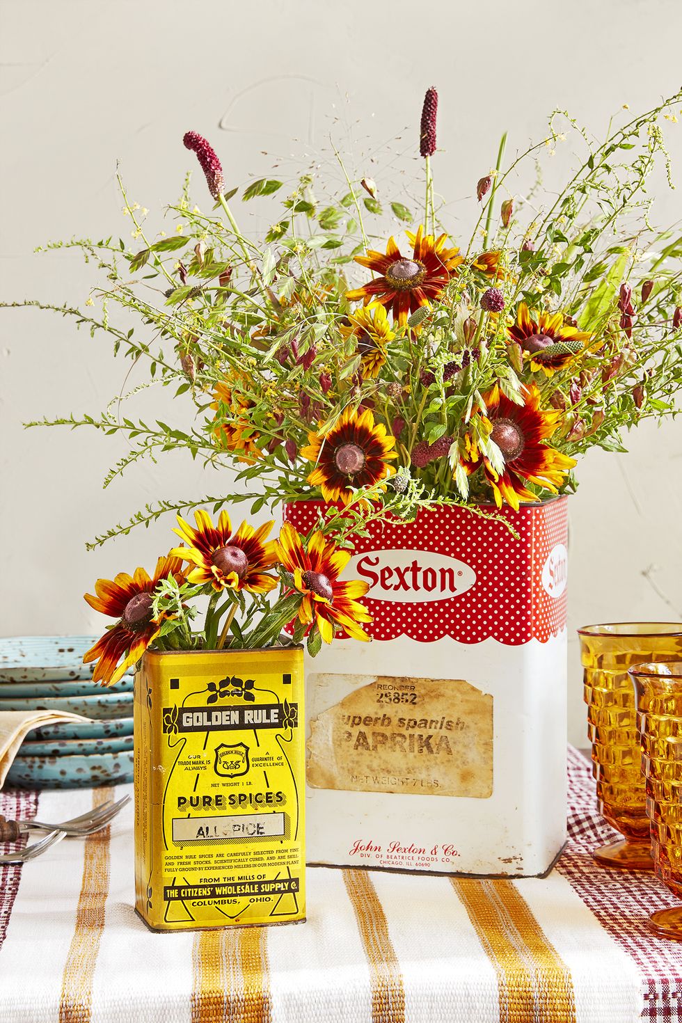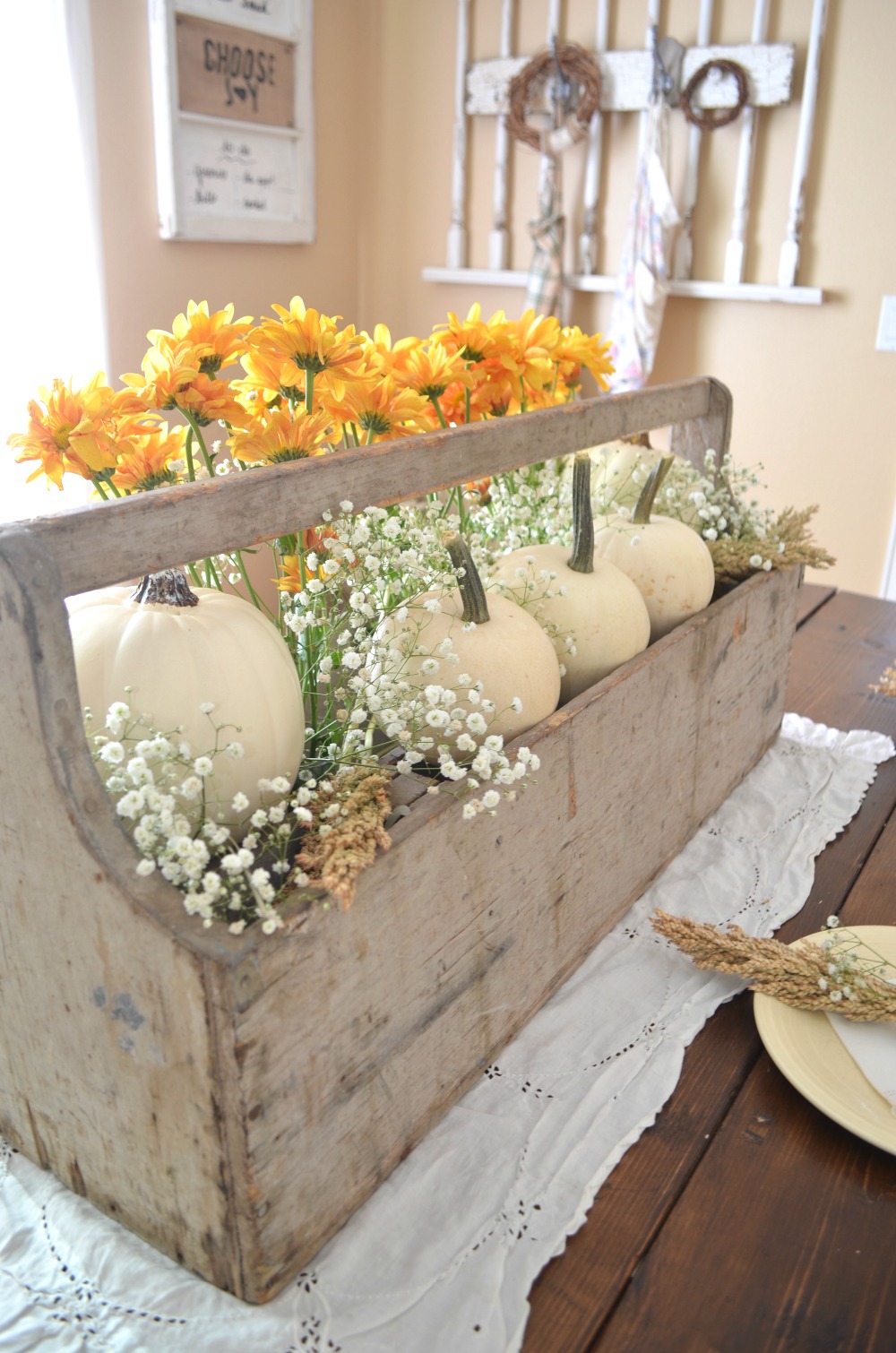 Who would have thought you could upcycle a vintage toolbox in such a cute way? The wheat at the place settings is a charming touch!