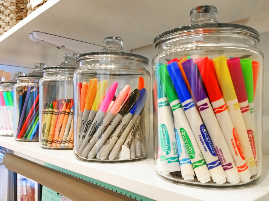 Look at how Amanda has organized her craft room itself to be as pretty as the rest of the home decor. All of the markers and crayons are visible, in attractive containers.