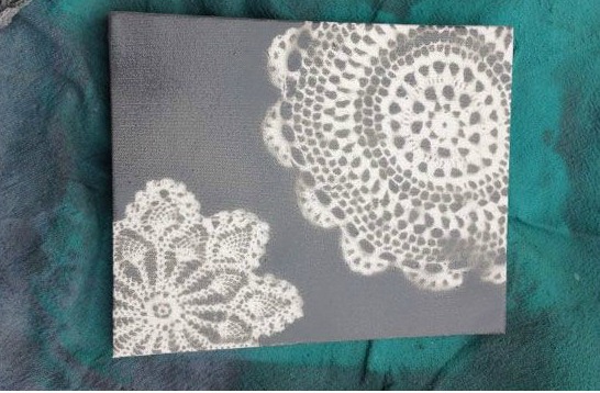 Doesn’t this look kind of like snowflakes or tie-dye? Made with spray paint and paper doileys.