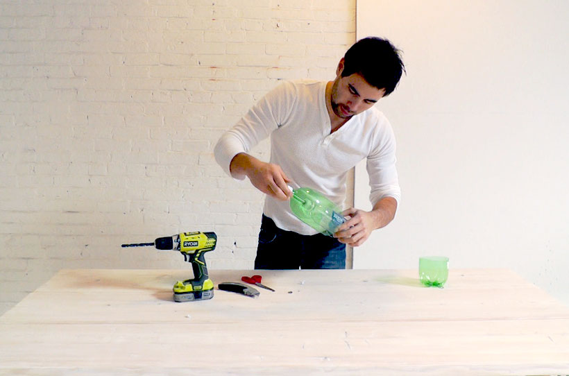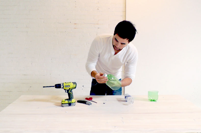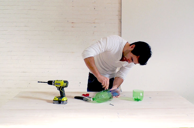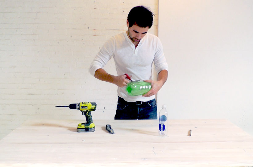 The first step is to poke a hole in the large soda bottle and cut around to the size you want the lamp to be.