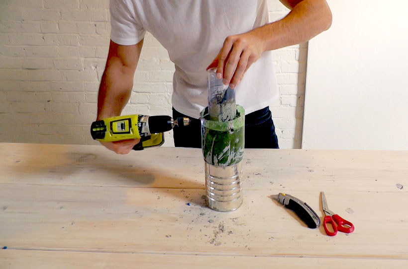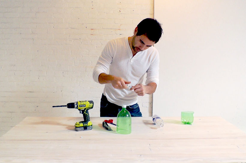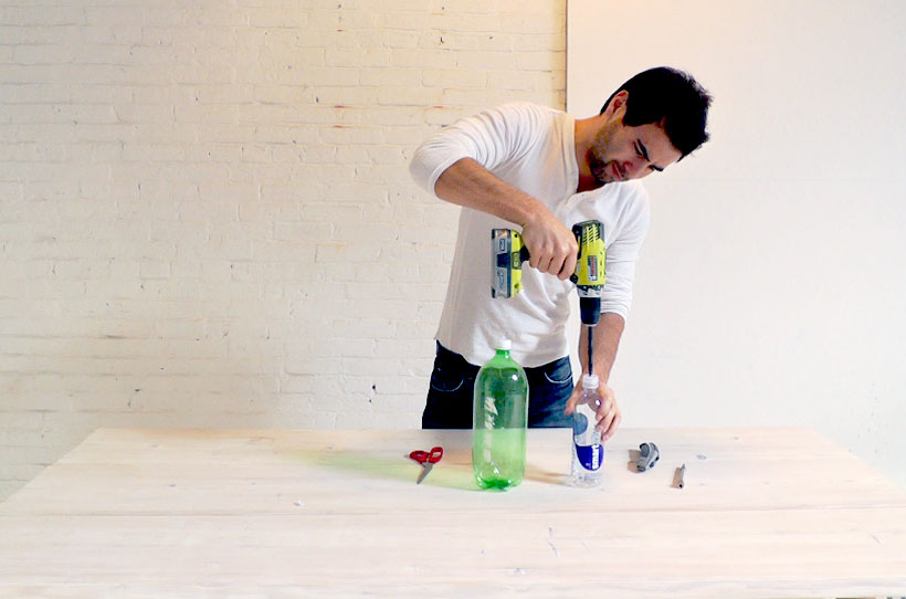 The next step is to drill holes in the caps of the soda bottles. The hole needs to be big enough for the metal tube to just fit through.