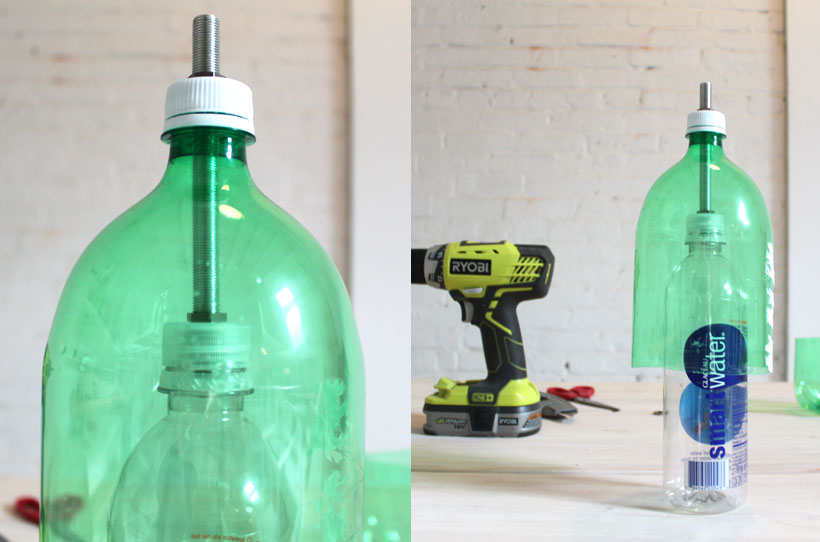 Connect the bottle caps by screwing the tube through the hole and using nuts to hold them in place.