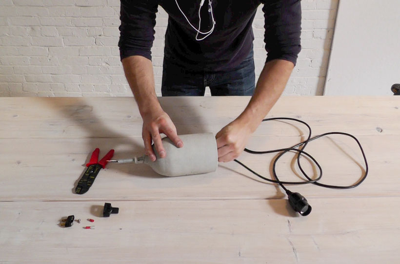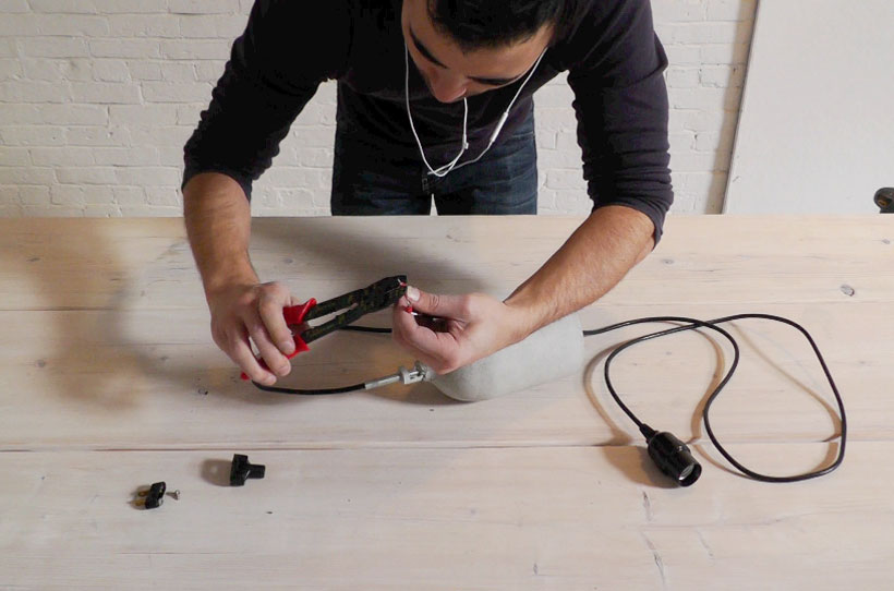 Sand the rough edges down with sandpaper and begin wiring the lamp. Cut the socket end of the wire and thread the cut end though the bolt hole. Strip the wires and twist them together. Cover the exposed metal with electrical tape or wire nuts and make sure the pendant is securely fastened.