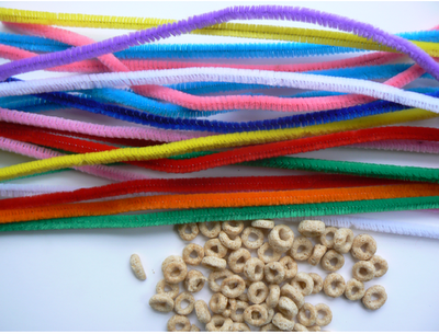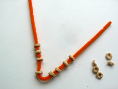 First, bend several pipe cleaners into a “V” shape and string with Cheerios. (Children as young as two-years-old really like doing this part.)